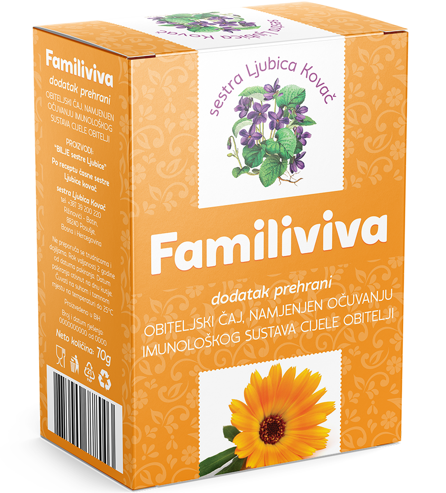 Familiviva je čaj namijenjen cijeloj obitelji. Uživanje u okruženju cijele obitelji možete upotpuniti čajem Familiviva. Čaj Familiviva blago djeluje na očuvanje respiratornog sustava u hladnim danima.